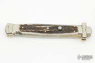 This lockback Auto by AGA Campolin has a mirror polished stainless steel spear point blade with false top edge. Handle is stag with mirror polished nickel silver bolsters, brass liners, stainless steel back spacer. Comes with a leather slip sheath and COA. Excellent condition.
