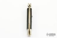 This lockback Auto by AGA Campolin has a mirror polished stainless steel spear point blade with false top edge. Handle is wood with mirror polished nickel silver bolsters, brass liners, stainless steel backspacer. Has some light scratches, otherwise excellent condition.