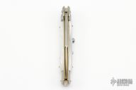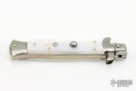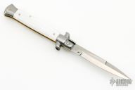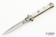 This 9" Picklock by Frank Beltrame features a polished bayonet ground 4mm blade with false top edge. The handle has stainless steel bolsters, front and rear, pearlex scales, brass liners, stainless spring. Excellent condition.