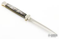 This lockback Auto by AGA Campolin has a mirror polished stainless steel spear point blade with false top edge. Handle is buffalo horn with mirror polished nickel silver bolsters, brass liners,stainless steel back spacer. Comes with a leather slip sheath and COA. Excellent condition.