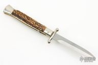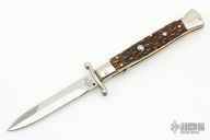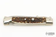This 9" Swinguard Auto from A.G.A. Campolin has a mirror polished stainless steel spear point blade with false top edge. Handle has stag scales with mirror polished nickel silver bolsters and pommel, fileworked brass liners, brass pins, fileworked stainless steel back spacer, and a safety. Has a couple light scratches, otherwise excellent condition.  Dated 2019