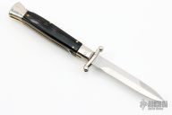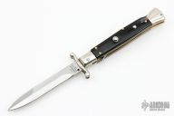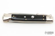 This 9" Swinguard Auto from A.G.A. Campolin has a mirror polished stainless steel spear point blade with false top edge. Handle has buffalo horn scales with mirror polished nickel silver bolsters and pommel, brass liners, brass pins, stainless steel back spacer, and a safety. Has a couple light scratches, otherwise excellent condition.  Dated 2019