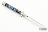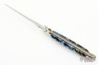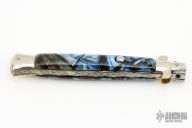 This pick lock auto by AGA Campolin features a mirror polished blade with a false top edge. Nickle silver guard and rear bolster, stabilized mammoth ivory scales, fileworked brass liners and engraved stainless steel backspacer. Nice function, strong firing. Excellent condition. Dated 2018. Comes with a zippered case.