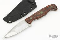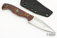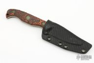 This knife by Joe Watson features a multi-ground and textured blade, .133" blade stock and 1.015" blade depth, full tang construction. The handle has black/red fat carbon scales with GITD inserts. Comes with a kydex sheath. Has some sheath scratches, otherwise good condition.