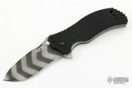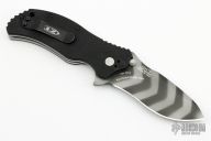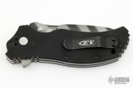 This 0350TS liner lock flipper is a Ken Onion design executed by Zero Tolerance and features a recurved spear-point blade with a tiger stripe finish, stainless steel liners and black G10 scales. It also features the Speed-safe assisted opening system. The black coated steel clip is 4 way adjustable. Perfect function. Includes original box and papers. Has some very light scuffs, otherwise excellent condition. #11534