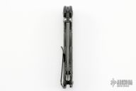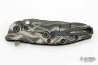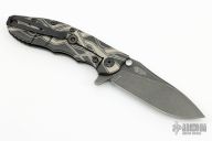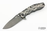 This Hinderer Designed 0562 Framelock Flipper has a blackwashed blade with swedge, notched thumbrest, dual thumb studs and flipper. Handle has a laser engraved titanium frame with stainless steel lockbar insert and lockbar stabilizer. Stainless steel clip is tip up. Includes original box and papers. Excellent Condition.