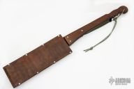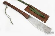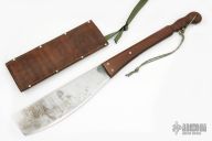 This Hog Splitter by Paul Cooper features a satin finished blade with .161" blade stock and 3.955" blade depth, half full tang construction. The handle has a burlap micarta grip, this is one BIG piece of micarta. Comes with a brown leather sheath. Has some patina, otherwise good condition. Very Sharp.