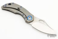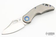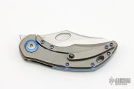 This Busker Gusto(B511-S), by Olamic Cutlery, features a satin finished clip point blade with a swedge thumb hole and notched front flipper. The handle is comprised of a bead blast finish titanium frame over an anodize finished titanium backspacer. Pocket clip is positioned for right hand, tip up carry. Components are titanium blue. Includes original padded case and makers card dated 10/30/2020. Excellent condition.