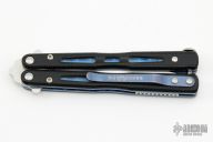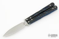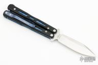 This Model 32 Morpho Balisong by Benchmade has a stonewashed spear point D2 stainless steel blade. Handle is black G-10 with blue anodized titanium liners and milled stainless steel spacers. Blue anodized titanium tip up clip. Has a few light scratches, otherwise excellent condition. Comes with a Benchmade Box.