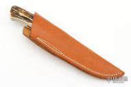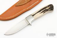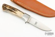 This drop point hunter by Russell Easler features a hand rub satin finished blade, .154" blade thickness and .957" blade depth, full tapered tang construction. The handle has satin finished stainless steel guard, stag scales with red liners. Comes with a brown leather sheath.  Light oxidation is visible on the guard otherwise the knife is excellent Condition.