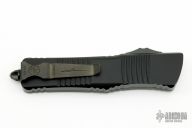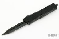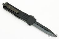 This Combat Troodon OTF automatic by Microtech knives features a double edged, DLC finished reverse full serrated blade. The handle has a DLC milled aluminum handle with black hardware, tip down carry. Glass breaker. Comes with original box and papers. Excellent condition. s/n 011 dated 03/2022.