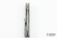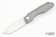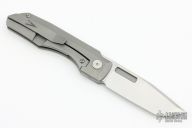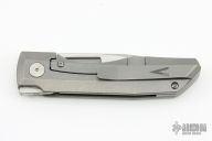 This Impulse Mini by Vero Engineering features a stone wash finished blade with notched thumbrest and flipper. The handle has a tumbled titanium frame with satin titanium hardware, matching tip up clip with hidden screws and backspacer. Nice detent, lockup and blade seating. Comes with a zippered case and COA. Excellent condition. #075.