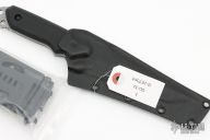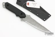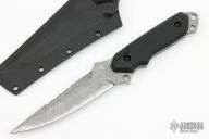 This Fighter by Kiku Matsuda features a clip point blade with a sharpened top-edge, partial serrations and a full tang construction. .158" Blade Stock.  1.138 The handle features black G-10 Scales.  Includes a black kydex sheath.  Excellent Condition.