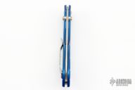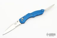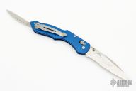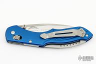 The Switchback is a Warren Osborne design featuring a main AXIS actuated blade and a slipjointed second blade on the back end. This Switchback has a satin combo edge blade and anodized blue frame. Pre-production. Numbered 0541/1000. Includes original box and paperwork. Excellent condition. Blade Steel: S30V (Main) & 440C (Slipjoint)