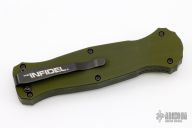 This Infidel is built with an olive drab handle and we've upgraded the blade steel from D2 to premium S30V in a black DLC finish.