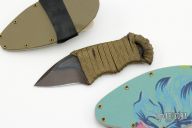 This Snuggler by Tracker Dan features a drop point blade with .113" blade stock and .850" blade depth. The handle has flat paracord wrap. Comes with 2 ambidextrous kydex sheath. Excellent condition.