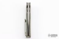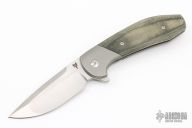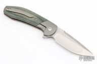 This VBR by Reate is a Mark Varga design, it features a satin finished blade with flipper. The handle has a bead blasted titanium frame with green canvas micarta scales, bead blasted titanium backspacer and tip up clip. Excellent condition.
