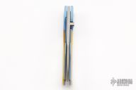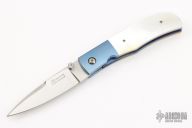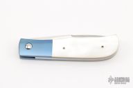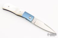 This linerlock folder by LJ Thompson features a hand-rubbed satin finish blade with a single thumbstud. The handle has anodized and dovetailed titanium bolsters, gold lip pearl scales, anodized titanium liners, stainless steel backspacer. Nice detent, lockup and blade seating. Excellent condition. Comes with a zippered case.
