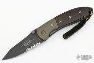 This Lightfoot LCC D/A side opener by Microtech has a black partially serrated blade, bead blasted titanium bolsters, and micarta scales. Stainless steel clip and liners. Dated 07/2022 and #6728. Has a few light scratches otherwise good condition.  Includes a padded zippered case.