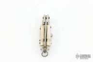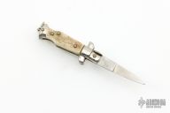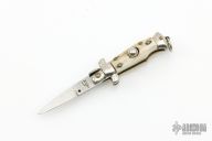 This auto features a spear point blade with a false top edge. Nickle silver guard and rear bolster and stag scales, brass liners. Nice function, strong firing. Has some light scratches, otherwise excellent condition.