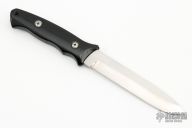 This Y2K knife by Allen Elishewitz features a hand rub satin finished blade with .200" blade stock and 1.017" blade depth, hidden/mortise tang construction. The handle is black G-10. Has a few light scratches, otherwise excellent condition.