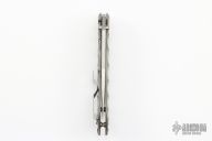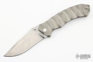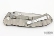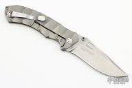 This Olamic Cutlery designed folder features a tumble finished blade with notches in blade spine and dual thumbstuds. The handle has a contoured and bead blasted titanium frame with tip up stainless steel clip, left or right reversible. Hinderer lockbar stabilizer. Excellent condition.