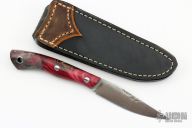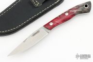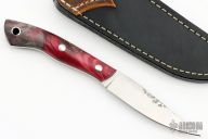 This Trout and Bird by Lon Humphrey features a satin finished blade with .133" blade stock and .779" blade depth, full tang construction. The handle has dyed burl scales with black liners and steel pins and lanyard tube. Comes with a leather sheath and original box. Excellent condition.
