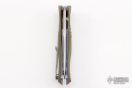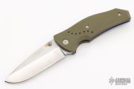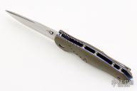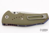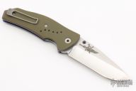 This Spatha linerlock folder features a hollow ground tumble finish blade and OD green G10 handle with a total of 13 ruby bearing insets. Stainless steel clip. Notched thumbrest. Gold Elishewitz logo medallion on blade. Smooth action. Perfect blade seating, detent, and lockup. Excellent work. Numbered 15 on blade. Excellent condition. Some additional information from Allen about this design: "This is a limited edition that I have been wanting to make for a very long time. This knife has a lot of Marines symbolisms in it: 13 ruby ball bearings for the 13 original colonies, OD green for our uniform color, red handle liners for the blood stripes, blue anodized titanium liners for the dress blues, 7 serrations for the 7 seas. The knives are numbered and feature the "Jack-of-all-Trades" logo on the back of the blade. This logo is used by Marines Reconnaissance to show their versatility in air, land and sea. There are many different versions of this logo from Companies to Platoons; I have had this one since I was in 4th Recon."