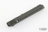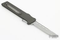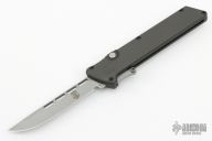 This M-6 OTF automatic by Rob Dalton features a bead blasted blade and a black aluminum handle. Fires via push button and retracts by holding the button and moving the slider on the side of the knife. Has a few light scuffs, excellent condition.