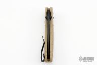 This axis locking folder features a black blade with dual thumb-studs and a notched thumb-rest. The handle has sand colored FRN scales and black stainless steel liners and tip up (left or right) clip. Comes with the original drawstring bag, box and papers. Excellent condition.