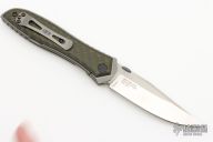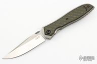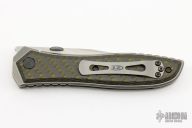 This knife by Zero Tolerance is an Emerson design. It features a two-tone blade with thumbdisc. The handle has green carbon fiber scales, stonewashed titanium frame and tip up titanium clip, left or right reversible. Comes with original box, and papers. Excellent condition. s/n 3216