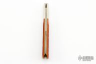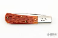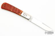 This Madison Barlow from Northwoods Knives features a polished blade with swedge and long pull. The handle is comprised of nickel silver arrowhead bolsters with jigged bone covers and over brass liners and steel backspring. Comes with a leather slip sheath. Has a few light scratches, otherwise excellent condition.