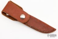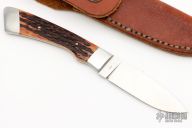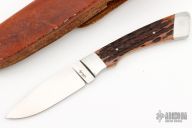 This knife by Eugene Shadley features a hand rub satin finished blade with .088" blade stock and .728" blade depth, full tang construction. The handle has dovetailed stainless steel bolsters, jigged bone scales. Coems with a brown leather sheath. Has a couple very light scratches, otherwise excellent condition. #1039 on the blade.