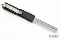 This UTX-85 OTF automatic Tactical Beard Comb by Marfione Custom Knives features a fine tooth hand ground stonewashed comb blade, and a black aluminum handle with tip down bead blasted stainless steel clip. Dated 01/2023. Excellent condition. Comes with original box, zippered case and COA.