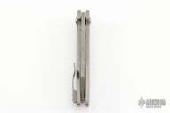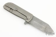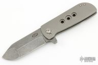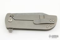 This Spur flipper from Jamie Simeon/Simeon Custom Knives features a duplex ground blade with an acid tumble finish and flipper. The handle is comprised of bead blasted titanium frame over titanium barrel spacers with matching hardware. Bead blasted titanium tip up clip. Great blade seating, detent and lock up. Excellent condition.