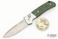 This ATCF Auto by Pro-Tech features a stonewashed Magnacut blade with notched thumbrest. The handle has a stainless steel frame with Fat carbon scales, tip up milled titanium clip with hidden screws.  Black lip pearl inlaid into the push button. Comes with original box and papers. New from maker at the 2023 CCKS.