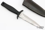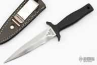 This Mark 1 dagger by Gerber is double-edged and high satin finished, .237" blade stock and .895" blade depth, hidden tang construction. Black coated aluminum handle. Comes with brown leather sheath with boot clip. #H5936S. Has a couple light scuffs, otherwise excellent condition.
