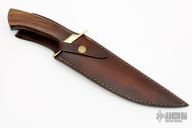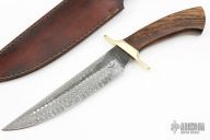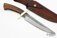 This Knife by SMID Damascus features a Damascus blade with a false top edge, .141" blade stock and 1.568" blade depth, hidden tang construction. The handle has a brass guard, wood grip with white spacer. Comes with a brown leather sheath. New from maker.