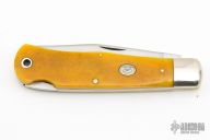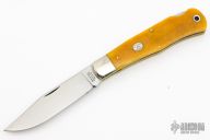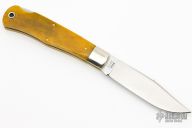 This lockback by Moore Maker features a satin finished blade with nail nick. The handle has nickel silver bolsters, yellow bone scales, brass liners, stainless steel spring. Has some light scratches, otherwise excellent condition.
