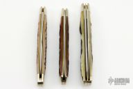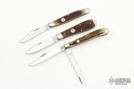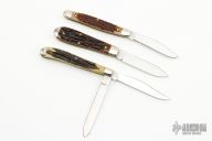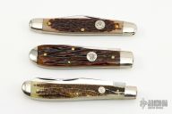 These Slipjoints by Queen Cutlery feature clip point blades with nail nicks. The handle is comprised of nickel silver bolsters and jigged bone covers, brass liners and steel backspring. Have a few light scratches, otherwise excellent condition.
