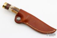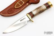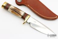 This is a RARE Model 25 Mini by Randall Made Knives, it is #545 of only 1500 made by Randall between 1996 and 1998. Identical to the standard Model 25 but scaled down. Has a drop point blade with false top edge, notched thumbrest, .150" blade stock and .896" blade depth, hidden tang construction. The handle has a brass guard and butt with a stacked leather and stag handle, black and brass spacers. Comes with brown leather sheath and a zippered case. Excellent condition.
