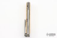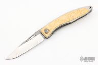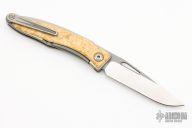 This Mnandi by Chris Reeve Knives has a satin finished blade with notched thumbrest and nail nick. The handle has a bead blasted and satin finished titanium frame with box elder burl inlays. Titanium clip, tip up carry. Comes with a brown leather slip sheath, original box and COA dated Jan 17, 2022. Has a couple light scuffs on the blade, excellent condition otherwise.