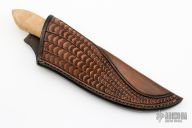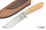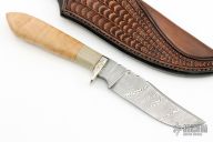 This Hunter by Journeyman Smith Jody Muller features a Damascus blade with fileworked spine and false top edge, .225" blade stock and 1.174" blade depth, hidden tang construction. The handle has an engraved nickel silver guard, maple wood grip and stag spacer. Comes with a hand tooled brown leather sheath. Excellent condition.