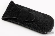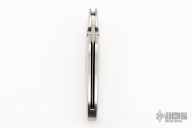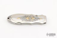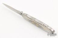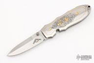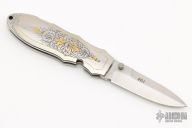 This Lockback from Warren Osborne features a hand rub satin finished blade with false top edge and dual thumbstuds. The handle has a stainless steel frame with 24k got inlaid engraving. Includes a stingray skin case. Has a couple light scratches, otherwise excellent condition. #001 on the blade.