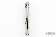 This Kershaw assisted opening flipper has been customized by Santa Fe Stoneworks, it features a bead blast blade and back side of the stainless steel frame. Aztec Gold Marble and Gold Lip Pearl  scale on front of handle, tip up or down reversible stainless steel clip. Nice lock up, blade seating and detent. Excellent Condition. Comes with original box and papers from Santa Fe Stoneworks.