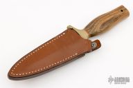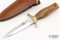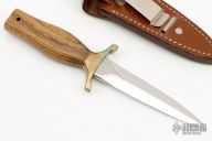 This Mark I Presentation Boot Dagger by Gerber features a mirror polished double edged blade, .222" blade stock and .933" blade depth, hidden tang construction. The handle has a brass guard, and wood handle with red and white spacers. Comes with original brown leather sheath. #0475 blade. Has some patina and a couple of marks on the wood, otherwise excellent condition.