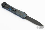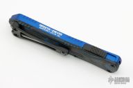 This Manticore-S by Heretic Knives has a DLC recurve blade and a blue camo carbon and blue aluminum handle. Out-the-Front knife with a clean and functional aesthetic. It features a contoured aluminum chassis with jimping all along the sides. This lightweight and capable OTF knife opens and closes smoothly, making for an excellent everyday or tactical carry. Comes with a ball-bearing glass breaker and a deep carry pocket clip. Comes with original box and papers. New from maker. #178