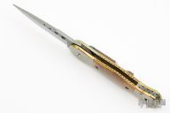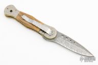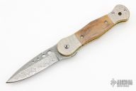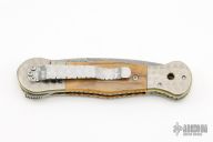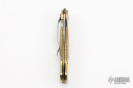This Dressed linerlock folder from Crawford knives features a Daamasteel blade with a false top edge and notched thumbrest and flipper. The handle has a jeweled and anodized titanium frame, mammoth ivory scales, fileworked and jeweled titanium liners, fileworked Damascus backspace, tip down jeweled stainless steel clip. Smooth action with a nice blade seating and lockup. Has some light scratches, otherwise excellent condition. Comes with a zippered case.