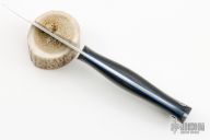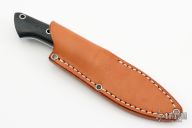 This Fox River Featherweight by Bark River Knives features a satin finished blade with .096" blade stock and .877" blade depth, full tang construction. The handle has black canvas micarta scales with blue G-10 lienrs. Comes with a brown leather sheath and original box. Excellent condition.