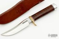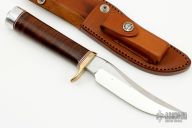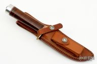 This Model 3-5 by Randall Made Knives features a satin finished blade with false top edge, .214" blade stock and 1.148" blade depth, hidden tang construction. The handle has a brass guard, stacked leather grip with red/white/blue spacers, duralumin butt. Comes with a brown leather sheath with sharpening stone and brown stitching. Has some small oxidation spots on the blade, has a few light scratches, otherwise good condition.
